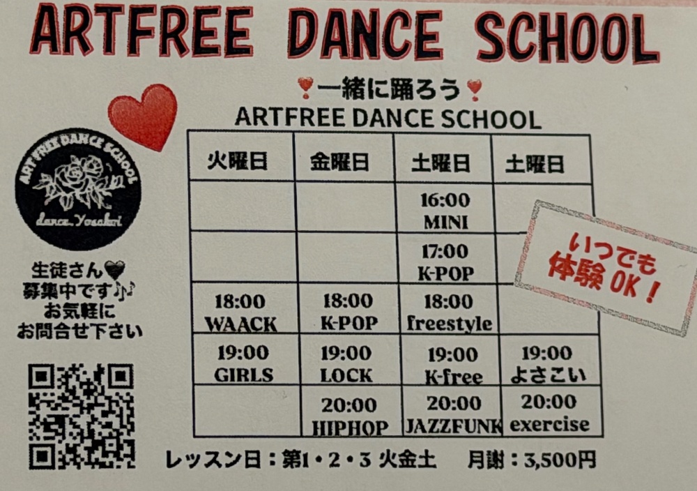 ダンス初めてさんにオススメのクラス、ステージは苦手だけど皆んなとわちゃわちゃ踊りたい女の子向けクラス、カッコ可愛いK-POPクラス、キッズクラス、色んなジャンルを踊れるフリースタイル、身体をガッツリ使うYOSAKOI、などなど盛りだくさん!!